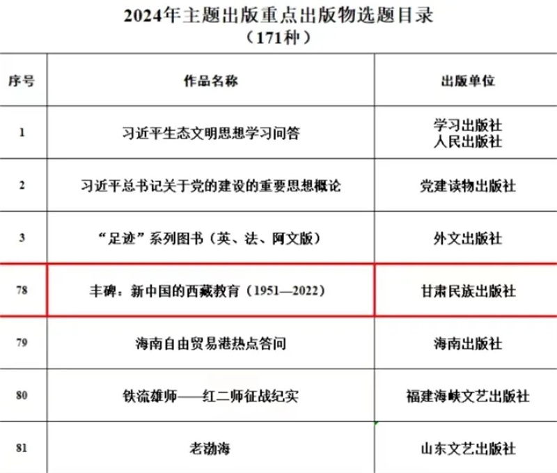 据《中央宣传部办公厅关于公布2024年主题出版重点出版物选题的通知》,甘肃民族出版社《丰碑:新中国的西藏教育(1951—2022)》入选选题目录。